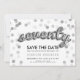 Design de "70 Festa de aniversário Salve a Data" elegante com as Letras Balões e o confete Glitter Silver e o nome personalizado e o texto de detalhes. Imprima sua família e amigos com este na moda e design glamouroso. Fácil de usar e fácil de personalizar. Faça o pedido hoje!