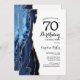 convite de aniversário 70 azul, branco e dourado agate. Elegante design moderno com cor azul-real de água agate marble geode fundo, fonte falsa de ouro brilhante e script de tipografia. Trendy convida o cartão perfeito para uma comemoração de dia das mulheres na moda. Impressos convites Zazzle ou modelo de impressão digital instantânea para download.