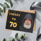 Um convite de aniversário de 70 de tendências. Com o texto: até 70 na frente, escrito com letras falsas de balões de ouro. Fundo preto. Com ouro confetti. Modelo para sua foto. Adicione os detalhes do evento no verso. Letras brancas, fundo preto.