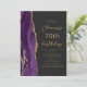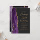 A borda esquerda deste elegante convite de aniversário moderno apresenta uma cor d'água roxa, borda agitada com brilho dourado. O texto personalizável combina o script dourado e as fontes sans serif em um fundo preto de slate. O verso apresenta um design de agate roxo e dourado correspondente.