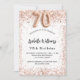 Para um 70 elegante aniversário. Um fundo branco. Decorado com rosa dourado confetti. Personalize e adicione um nome e detalhes da festa. O nome é escrito com um script de estilo manuscrito, número 70 com fontes de estilo de balão.