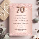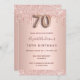 Um convite moderno, na moda e glamouroso para uma festa de aniversário 70. Um fundo metálico rosa dourado falso com um brilho elegante rosa dourado, pintura gota-a-gota. O nome é escrito com um moderno e escuro, rosa dourado, escrito com letra de estilo manuscrito. Personalize e adicione os detalhes da sua festa. O número 70 é escrito com uma fonte de estilo de balão, script.