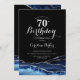 convite de aniversário 70 azul marinho, preto e prateado. Elegante design moderno com cor azul-real de água agate marble geode fundo, faux glitter prata e script de tipografia. Trendy convida o cartão perfeito para uma comemoração de dia das mulheres na moda. Impressos convites Zazzle ou modelo de impressão digital instantânea para download.