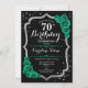 Convite de aniversário 70. Elegante design verde-esmeralda floral com prata brilhante e rosas. Possui fonte de script na moda e confetti. Perfeito para uma festa de glam das mulheres. Pode ser personalizado para qualquer idade! Impressos convites Zazzle ou modelo de impressão digital instantânea para download.