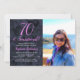 70 e Sensational Pink Black Photo Birthday Invitation Personalize este elegante convite de aniversário preto rosa com o nome e a foto da pessoa que celebra um dia muito especial em sua vida. Um aniversário de 70 é um marco especial para celebrar. Marque a ocasião criando uma festa e enviando convites para todas as pessoas especiais em sua vida. Compre nossa loja de presentes que você pode personalizar com este mesmo design elegante em canecas de presente de aniversário, etiquetas de vinho e cartões de aniversário.