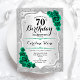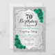Convite de aniversário 70. Elegante design verde esmeralda floral com rosas. Apresenta faixas de prata com brilho inverso e fonte de script. Perfeito para uma comemoração de dia das mulheres na moda. Pode ser personalizado para qualquer idade! Impressos convites Zazzle ou modelo de impressão digital instantânea para download.