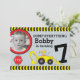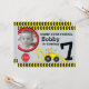 Convite de aniversário de 7 de construções com escopo de escavador e faixas de aviso amarelo e preto brilhantes. Perfeito para convidar os amigos favoritos do seu filho para a sua construção / construção de uma cesta de aniversário. Personalize com seus próprios detalhes de aniversário. Desenvolvido e ilustrado exclusivamente por Sarah Trett.