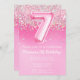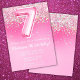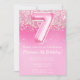 7 cor-de-rosa Aniversário Convite Girly Pink Glitter convite de aniversário para uma menina de 7 anos com escrevendo moderno de escrita e balões de folha divertida.