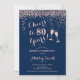 Convite de aniversário de 80. Saúde Para 80 Anos! Design elegante em azul marinho e ouro rosa. Apresenta óculos de champanhe, fonte de script e confetti. Perfeito para uma festa de aniversário na moda oitenta. Personalize com seus próprios detalhes. Pode ser personalizado para mostrar qualquer idade.