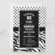 Um convite de aniversário surpresa 80 preto e branco com bolinhas e listras zebra.