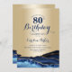 convite de aniversário 80 azul e dourado agate. Elegante design moderno com cor azul-real de água agate marble geode fundo, fonte falsa de ouro brilhante e script de tipografia. Trendy convida o cartão perfeito para uma comemoração de dia das mulheres na moda. Impressos convites Zazzle ou modelo de impressão digital instantânea para download.