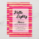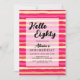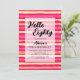 Este convite de 80 de aniversário colorido e divertido apresenta um padrão sem costura de listras angustiadas contendo cores rosa, vermelha, laranja e pêssego.