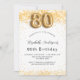 Para uma festa de aniversário elegante. Um fundo branco chic. Decorado com brilho de ouro falso, brilhos. Personalize e adicione um nome, idade e detalhes da festa. O nome é escrito com um script de estilo manuscrito. Número 80 com letra de estilo de balão.