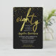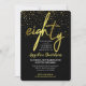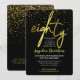 Um convite de aniversário 80 lindo e moderno. Este fabuloso convite apresenta a tipografia do efeito do ouro sobre um fundo preto com o confete dourado. Fácil de personalizar com seus próprios detalhes de celebração de festas de aniversário.