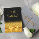 Convite de festas elegante, clássico, glamouroso e feminino. Uma fita e um arco dourados com brilho e brilho de ouro, um pouco de brilho e luxo para um aniversário. Fundo preto. Com o texto: 80 Birthday! na frente Adicione os detalhes do evento na parte traseira.