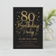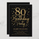 80th birthday party invitation in black and gold. Trendy modern design, perfect for a stylish men's or women's bday celebration. Features script font and confetti. Customize with your own details. Printed Zazzle invitations or instant download digital printable template.