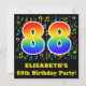 A frente deste design de convite de aniversário divertido, colorido e vibrante apresenta um grande número "88" com um padrão inspirado de gradiente de espectro arco-íris, junto com um nome personalizado e a mensagem "88ª Festa de aniversário!". Parte do plano de fundo tem um padrão divertido de várias notas e símbolos de música com uma variedade de cores e tamanhos. A parte traseira apresenta detalhes/informações personalizadas sobre o evento para o qual os potenciais convidados estão sendo convidados. Cartões de convite para comemoração de aniversário felizes e personalizados como este podem ser usados quando se convidam convidados para comparecer a uma reunião realizada para honrar uma canção de compositor, um músico, um cantor ou o oitavo aniversário de outra pessoa. [~Z0000427]