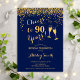 Convite de aniversário de 90. Saúde Para 90 Anos! Design elegante em marinho e ouro. Apresenta óculos de champanhe, fonte de script e confetti. Perfeito para uma na moda 90 festa de aniversário. Personalize com seus próprios detalhes. Pode ser personalizado para mostrar qualquer idade.