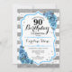 Convite de aniversário de 90. Design elegante em azul-azul-azul-azul-claro-brilhante, branco e azul-aqua-turquesa. Possui forte de script de na moda, listras e rosas azuis. Perfeito para uma bolsa mensageifesta de aniversario elegante. Pode ser personalizado em qualquer idade.