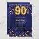 Um convite moderno e na moda para um 90 aniversário. Um fundo azul marinho, decorado com estrelas ouros. A cor azul é irregular. Personalize e adicione seu nome e detalhes da festa.
