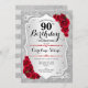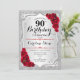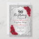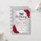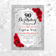 Convite de aniversário de 90. Design elegante em prata e vermelho. Apresenta faixas de prata com brilho inverso, fonte de script do rosa vermelha na moda e confetti. Perfeito para uma festa de aniversário de vidro.