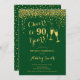 Convite de aniversário de 90. Saúde Para 90 Anos! Design elegante em verde e ouro. Apresenta óculos de champanhe, fonte de script e confetti. Perfeito para uma na moda 90 festa de aniversário. Personalize com seus próprios detalhes. Pode ser personalizado para mostrar qualquer idade.