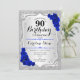Convite de aniversário de 90. Design elegante em prata e azul real. Apresenta fitas cintilantes de prata, fontes de script na moda e confetti de rosa de de safira. Perfeito para uma festa de aniversário de vidro.