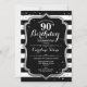 Convite de aniversário de 90. Design preto elegante com falso prata. Listras pretas e brancas com diamantes brilhantes confetti. Perfeito para uma bolsa mensageifesta de aniversario elegante.