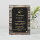 Um convite de aniversário de 90 de ouro rústico bordava madeira com texto dourado sobre fundo preto.