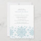 Flocos de neve de cor azul muito elegantes criam uma bonito borda ao longo do final deste convite de aniversário para adultos. A design moderna e minimalista tem uma sensação aberta e arejada. A estética contemporânea apelará a pessoas de todas as idades.