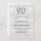 Um convite moderno, na moda e glamouroso para uma festa de aniversário 90. Um fundo com aparência de prata falsa, decorado com poeira brilhante. Personalize e adicione o seu nome e detalhes da festa. O número 90 é escrito com uma fonte de estilo de balão, script.