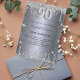 Um convite moderno, na moda e glamouroso para uma festa de aniversário 90. Um fundo com aparência de prata falsa, decorado com poeira brilhante. Personalize e adicione seu nome e detalhes da festa. O número 90 é escrito com uma fonte de estilo de balão, script.