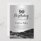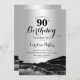 Convite de aniversário 90 preto e prateado. Elegante design moderno com fundo geode de pedra de pedra marmortal, letra falsa prata brilhante e script de tipografia. Trendy convida o cartão perfeito para uma comemoração de dia das mulheres na moda. Impressos convites Zazzle ou modelo de impressão digital instantânea para download.