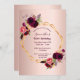 Na frente: Um convite para uma festa de aniversário 90. Um elegante e moderno rosa dourado falso plano metálico com uma falso estrutura geométrica dourada. Decorados com flores roxas escuras e burgueiras, rosas e penas do estilo "boho". Modelos para um nome e detalhes da festa. O nome é escrito com um script de estilo manuscrito, letras cor roxa. Fundo rosa dourado falso revestimento metálico