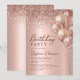 Celebre em estilo com este Convite de Aniversário do 90 de Balão de Balão Glitter, Elegante e Rosa moderno. Projetado com balões rosa dourados brilhante, borda cintilante, e um elegante roteiro de caligrafia de cauda de swash, todos colocados contra um fundo metálico de aparência de folha metálica rosa e suave. Perfeito para uma festa de aniversário glamourosa, esta design é facilmente personalizável para qualquer idade, fazer ideal para doces sessenta, 30, 40º, 50º, 60º, 70 ou qualquer celebração de marco.
