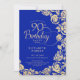 Convite de aniversário de 90 floral de ouro azul real. Design elegante com rosas, folha de ouro falsa e letra de script de tipografia. A Trendy convida o cartão perfeito para uma festa de na moda. Pode ser personalizado para qualquer idade. Personalize com seus próprios detalhes. Impressos convites Zazzle ou modelo de impressão digital instantânea para download.