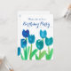 Um convite de aniversário de 90 bonito decorado com um jardim de flores tulipas pintadas manualmente em vários tons de aquarela azul e folhas primaveras verdes. Um bonito convite floral que você pode personalizar para ajustado das suas necessidades.