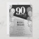 Convite de aniversário Elegante Black Silver Balloons 90 - Um modelo de convite de 90 masculino e elegante em espanhol. Celebre seu aniversário de uma grande maneira. Apresentando um fundo preto e cinza com um número prateado 90. Balões de prata e brilho enquadram o convite. Totalmente personalizável, este convite está disponível em formatos impressos e digitais, fazer fácil de compartilhar via texto, email ou mídia social. Perfeito para marcar este marco extraordinário.