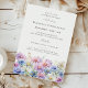 Os Elegantes Watercolor criam uma fronteira floral no final deste convite de aniversário. As flores púrpura, cor-de-rosa, azul e branca são o fazer de flores do mês de setembro, este é o tema perfeito para o seu aniversário de setembro.