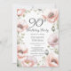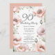 Elegante rosa pálido pingue-pongue design floral com design de "Festa de aniversário 90" com um quadro floral de papoilas cor-de-rosa sobre um fundo branco.