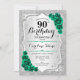 Convite de aniversário 90. Elegante design verde esmeralda floral com rosas. Apresenta faixas de prata com brilho inverso e fonte de script. Perfeito para uma comemoração de dia das mulheres na moda. Pode ser personalizado para qualquer idade! Impressos convites Zazzle ou modelo de impressão digital instantânea para download.