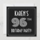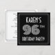 A frente deste estilo de 1920 da década de 1930 inspirou o design de cartão de convite para a festa de aniversário 96ª com um nome personalizável, um intrincado estilo de deco artístico inspirou o número "96º", a mensagem "FESTA DE ANIVERSÁRIO!" e uma fronteira multilinha. Por padrão, a frente também tem um fundo de cor preta, mas pode ser personalizado para uma cor diferente, se desejado. A parte traseira apresenta detalhes personalizados sobre o evento, como data, hora, local e quaisquer outras informações que possam ser úteis. Na moda, elegantes, convites personalizados como estes podem ser usados para convidar convidados/participantes para uma festa de aniversário que está sendo realizada para comemorar o 96º aniversário de alguém. [~Z0000615]