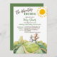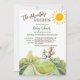 A aventura começa a raposa-bebê a andar de bicicleta sobre uma colina grande sob o modelo de convite para chá de fraldas solar. Aventura, natureza, animais selvagens e chás de fraldas da natureza para aventura ao ar livre, pessoas amorosas.