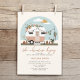 Aventura, chá de fraldas temático, com ilustração de um trailer de camponês, cor-de-rosa e branco, com roupas de bebê penduradas na linha de clothesline ligadas a pássaros sob um céu azul com sol e nuvens. texto diz "começa a aventura". Camper é decorado com macrame, terra de balão, pampas, cacto, tassel garland e plantas em potes.