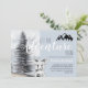 A aventura aguarda, as matas rústicas carregam convite de festas com ursos brancos, primeiros aniversarios em tons azuis de cinza macia, com pinheiros florestais majestosos e silhueta de montanha.
