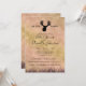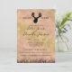 Elegante e Russo, "A Caça Acabou" Chá de panela de caça. Silhueta da cabeça de troféu de veado no topo com as palavras "A Caça Acabou" ao seu redor. Fundo é um gradiente do céu de pinks e creme castanho claro. Cozinha cor-de-rosa com um arco na orelha, no fundo, num campo verde rosa de grama. Tanto a mão como o veado são desenhados por ©Tina Hesskew, de Pesca Hunting Life.