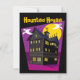 Convites à Casa Assombrados. Mansão de três andares preto assustador com guiões voando por cima do telhado, lua de cheio e janelas iluminadas. preto, roxo com sotaques amarelos e brancos brilhantes. Adicione o texto personalizado online.