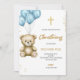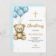 A christening invitation with a soft, pastel design features a teddy bear holding blue balloons, a gold cross, and elegant gold text on a white background.