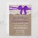 A coleção de casamento do arco Roxo é uma design impressionante que apresenta um adorável fundo de efeito de burvolta rústica com um romântico de efeito de renda branca vintage e um espantoso arco roxo. Esses convites podem ser personalizados para sua ocasião especial e farão o anúncio perfeito para um casamento, chá de panela, festa de noivado, festa de aniversário e muito, muito mais. *Observe que o Zazzle só vende convites impressos para que esses convites não tenham nenhum material real de arrombamento, rendas ou fita/ arco.