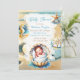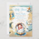 Convites de Bebê do Menino. Tema do chá de fraldas da orla costeira doce, castanho-macio e azul. Um garotinho dormindo dentro por um tempo e uma concha de ouro. Água azul bonito do oceano com cavalo marinho, estrelas e dólar de areia.
